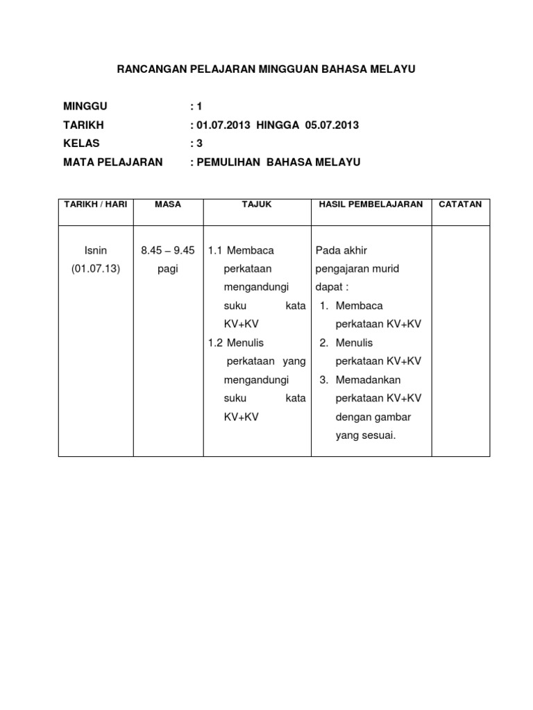 Rancangan Pelajaran Mingguan Bahasa Melayu Pdf