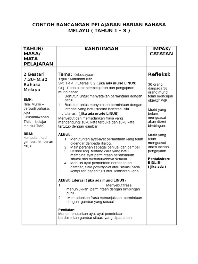 Contoh Rancangan Pelajaran Harian Bahasa Melayu Pdf